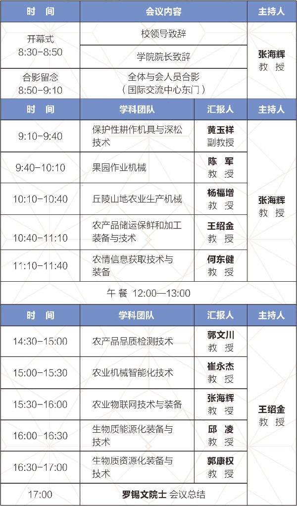 学科团队发展汇报会将于2017年12月22日在西北农林科技大学国际交流中心210举行。本次会议将邀请 学术院长罗锡文院士现场指导保护性耕作机具与深松技术、果园作业机械、丘陵山地农业生产机械、农产品储运保鲜和加工装备与技术、农情信息获取技术与装备、农产品品质检测技术、农业机械智能化技术、农业物联网技术与装备、生物质能源化装备与技术、生物质资源化装备与技术等10个研究领域的科研进展汇报,旨在探讨旱作农业机械与装备、精准农业关键技术与装备、生物质综合利用等学科的技术发展难题,推动学校相关学科及关键技术合作等方面协同创新发展。