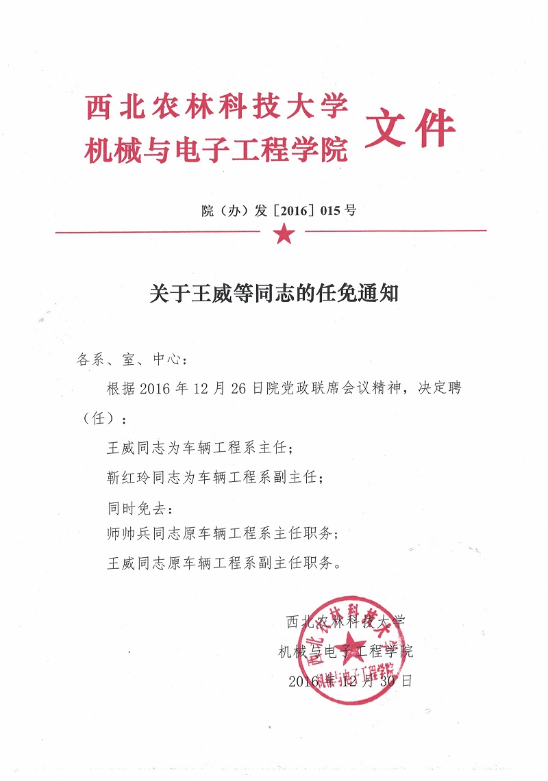 院(办)发[2016]015号关于王威等同志的任免通知